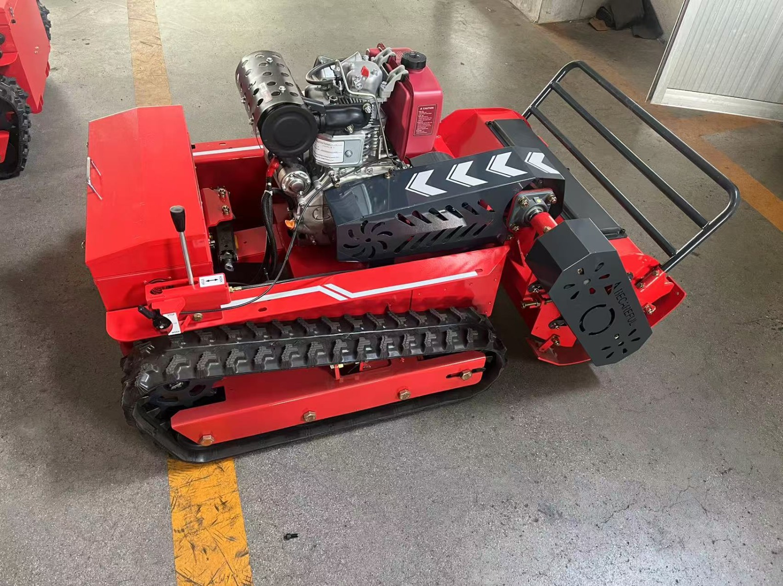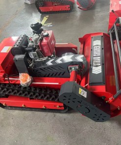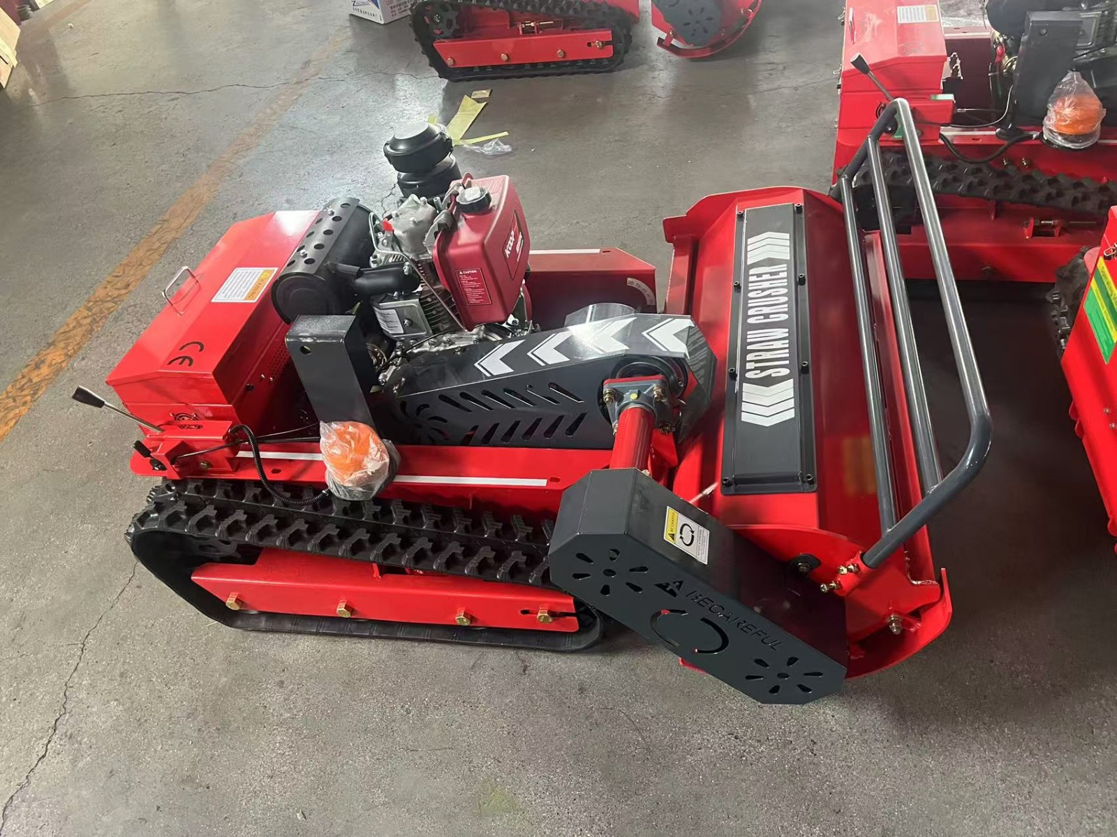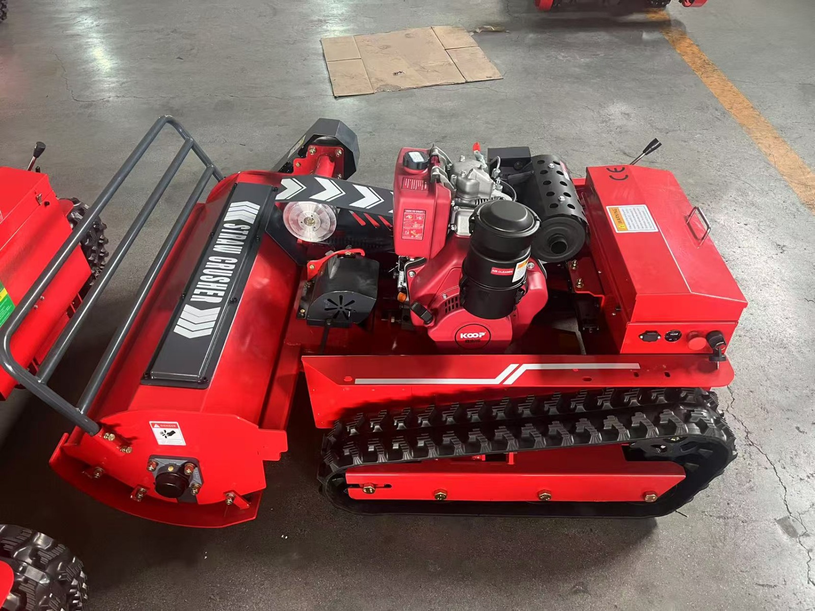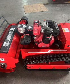 Robot desbrozador Híbrido Diesel, con ancho de corte de 1,2 metros, motor Koop modelo 195F de 15 cv, cuchillas ajustables desde 2 a 20 centímetros, motores de giros sin escobillas de 650w, peso de 400 kilos, orugas de goma. Ideal para desbroces forestales